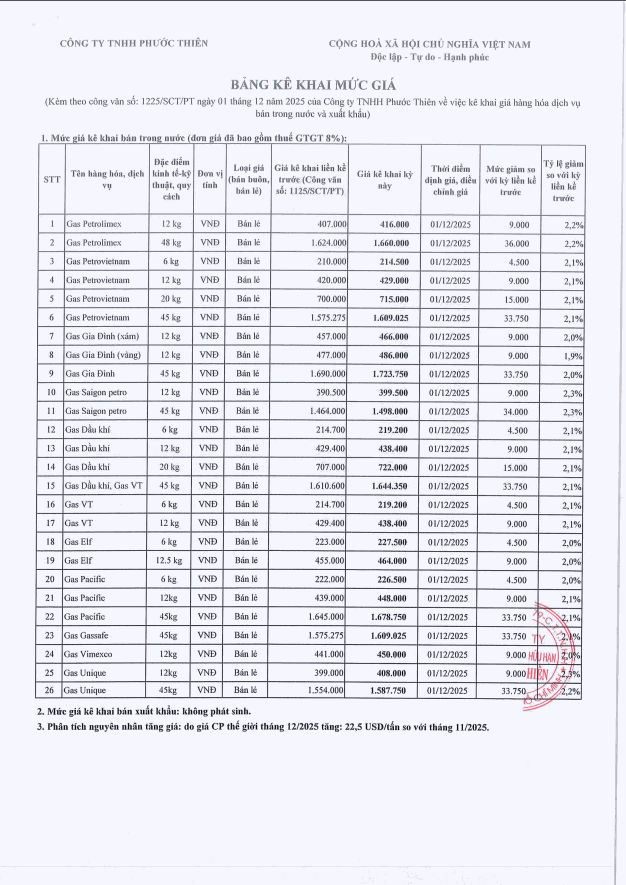 THÔNG BÁO GIÁ GAS BÁN LẺ THÁNG 12/2022